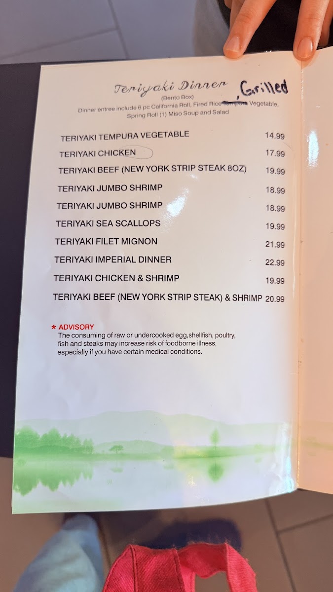 Shrimp tempura and avocado. Raw fish for sushi or cooked to order items from grill. Consuming of raw or undercooked egg shellfish, poultry fish and steaks may increase risk of foodborne illness.
