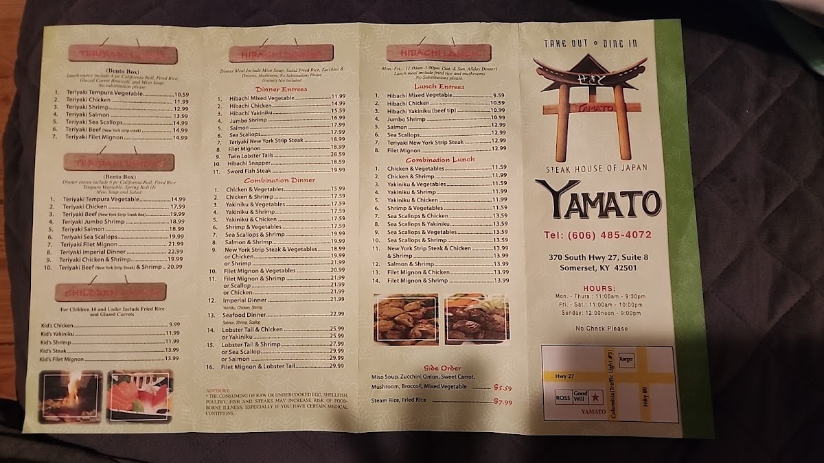 Overall, Yamato Steakhouse of Japan provides a wide range of Japanese dishes, each crafted with fresh ingredients and skillful preparation. Whether you're enjoying a Teriyaki Beef New York Strip Steak or indulging in sushi and sashimi, the restaurant’s diverse menu ensures there's something for every palate, all served in a cozy and welcoming atmosphere.