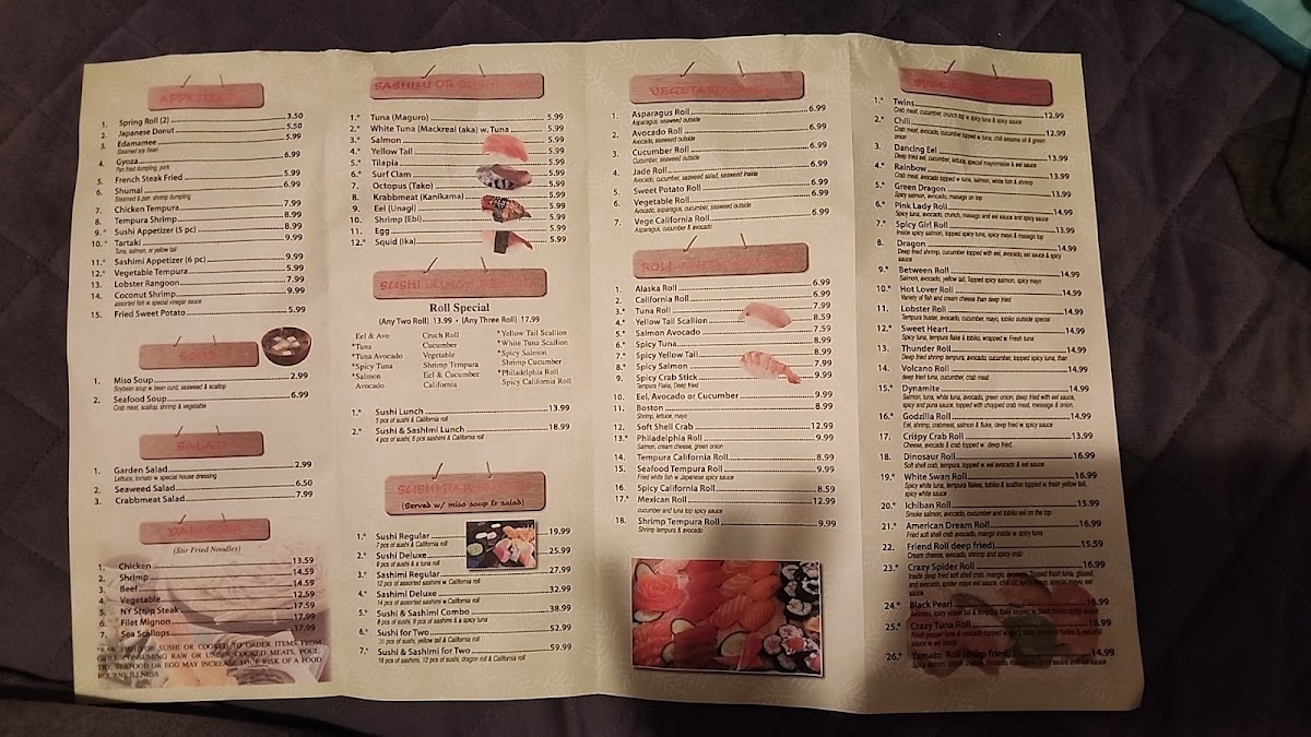 Crab, egg, onion, cucumber, am agobo and kampyo. Raw fish for sushi or cooked to order items from grill. Consuming of raw or undercooked egg shellfish, poultry fish and steaks may increase risk of foodborne illness.